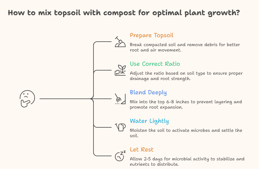 The best way to mix topsoil with compost is to combine 60% topsoil with 40% compost, blend it into the top 6-8 inches of soil, water lightly, and let it settle for 2-5 days before planting.